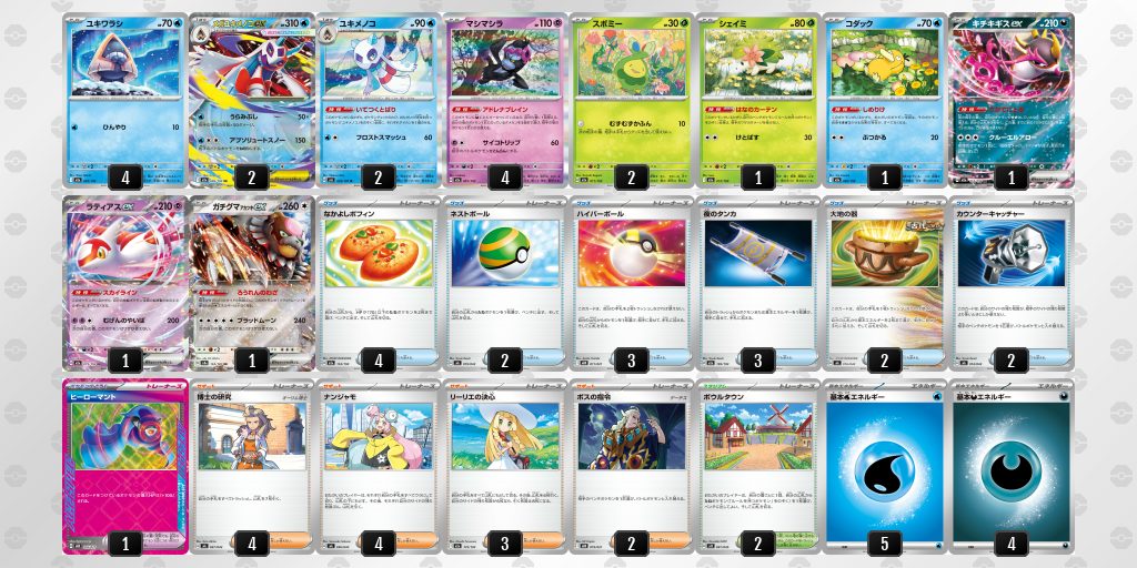 また、特性「いてつくとばり」を持つユキメノコも非常に強力。自分のポケモンにダメカンを乗せ、マシマシラの「アドレナブレイン」でダメカンを相手のポケモンに乗せ換えていこう。「いてつくとばり」で相手のポケモンに直接乗せるダメカンも合わせ、相手ポケモンのHPをどんどん削っていくことができる。メガユキメノコexの攻撃と合わせてサイドを一気に取っていきたい。